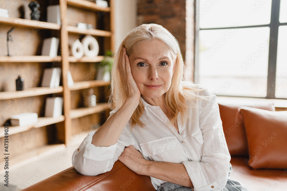 Portrait of a middle-aged caucasian mature businesswoman teacher ceo tutor leader sitting relaxing on the couch sofa at library home office, looking at the camera. Remote job occupation