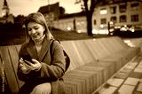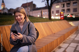 Portrait of young woman using phone while waiting the bus outdoors.