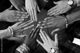 Palms up hands of happy group of multinational African, latin american and european people which stay together in circle
