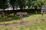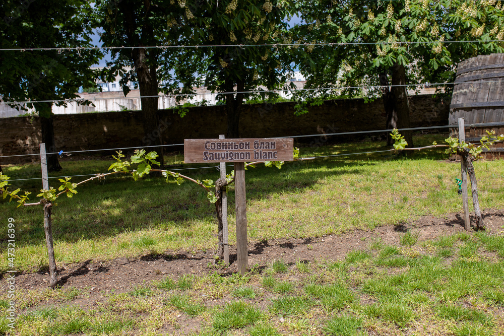 Wine growing yard with the sort of wine Sauvignon blanc written on the wood. Vineyards with new wine production near a winery. Grape field growing for wine. Summer scenery.