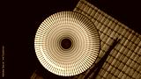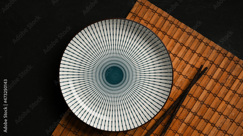 Table setting with blue and white ceramic plate with chopstick on bamboo placemat