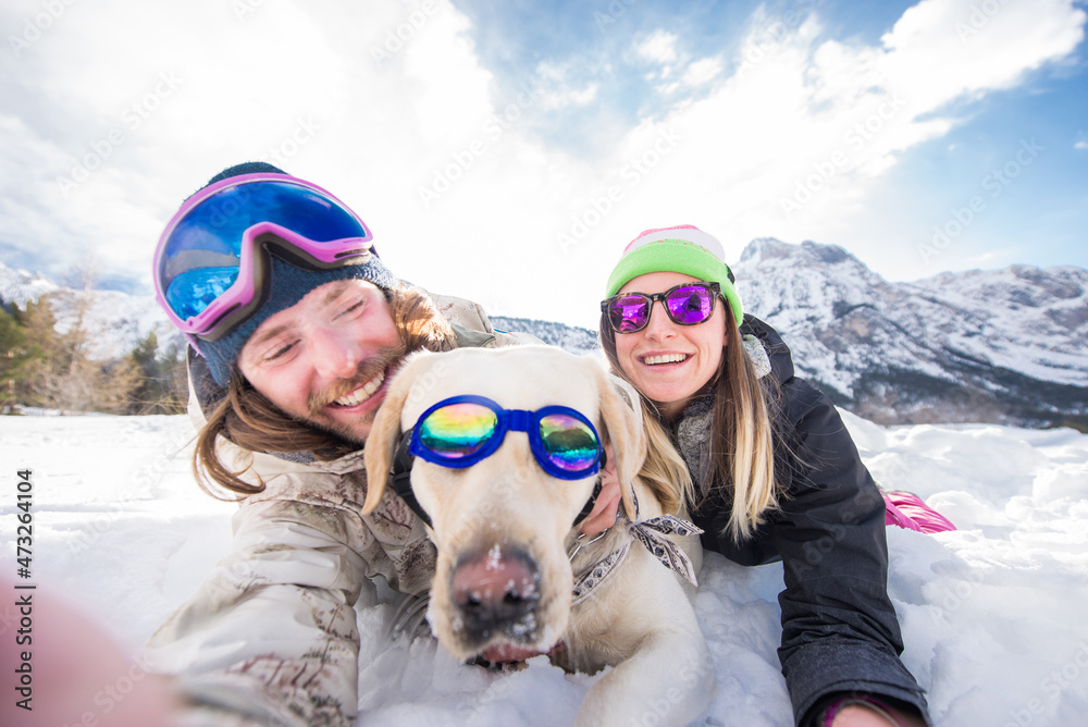 Couple playing with dog in the snow