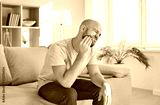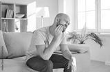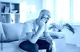 Dental health problems concept. Man suffering from strong toothache. Upset male patient with inflamed nerve, tooth abscess, or teeth sensitivity sitting on sofa and touching cheek with grimace of pain