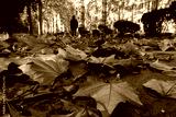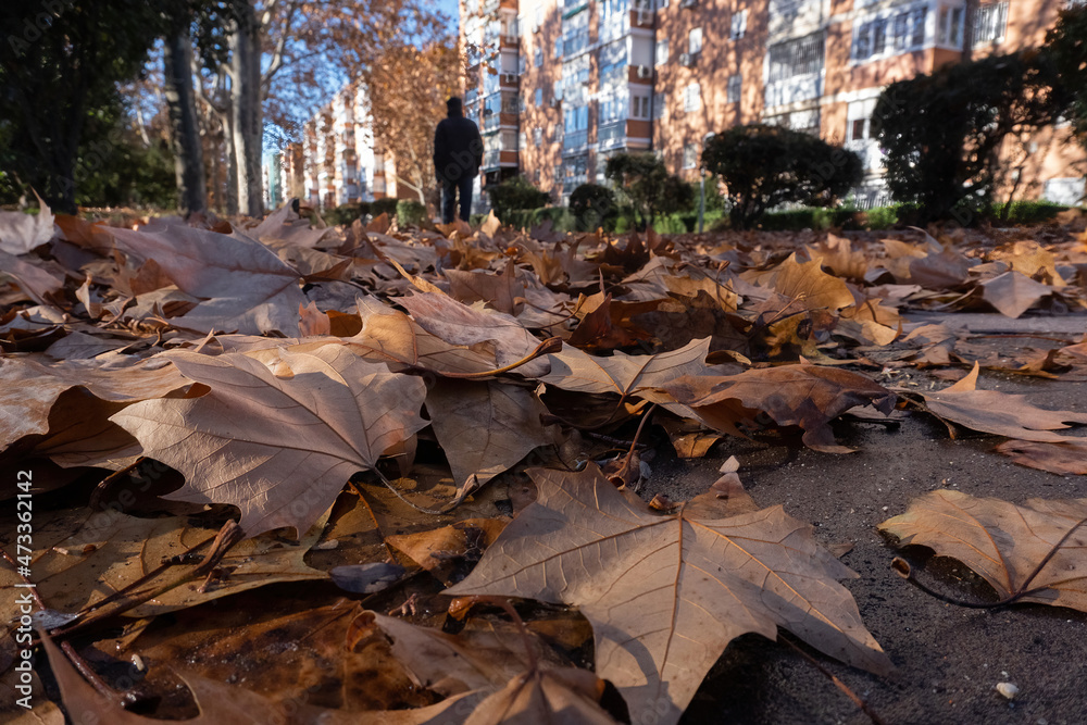 Autumn in the city. Fallen autumn dry leaves on the asphalt in a city park.