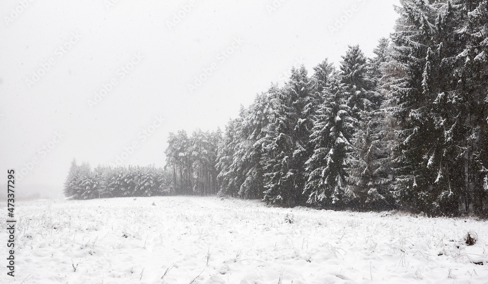 Winter forest landscape during heavy snowfall.