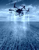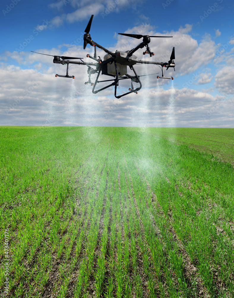 agricultural drone sprays rows of winter wheat sprouts on a background of beautiful sky,modern agriculture