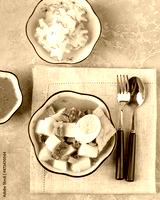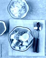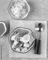 Lontong Kari Sapi or Indonesian Beef Curry with Rice Cake. Street Food Popular for Breakfast in West Java, Indonesia
