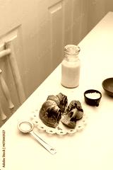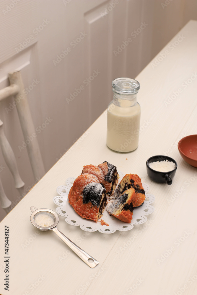 Marble Cake with Coffee with Powder Sugar and Kitchen Vintage Utensil, White Bakery Concept