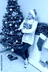 Young lady in white sweater and Santa hat stand with gift box near fireplace and dreaming, look up. Artificial New Year tree and home decoration. Concept. Calm atmosphere. Upcoming 2022 New Year