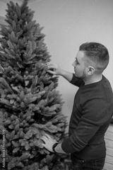 man in sweater sets up beautiful green artificial New Year tree, spruce in cozy living room at home in the evening. Concept of Christmas holidays, Festive Xmas night. Upcoming 2022 New Year tree