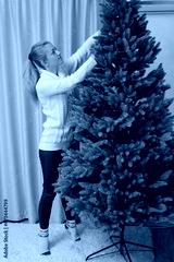 Young blonde lady in white knitted sweater and blue jeans decorates with balls and toys, fires artificial New Year tree and home in the evening. Concept of Christmas holidays. Upcoming 2022 New Year