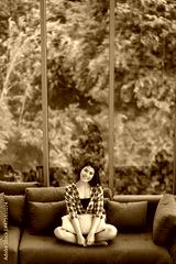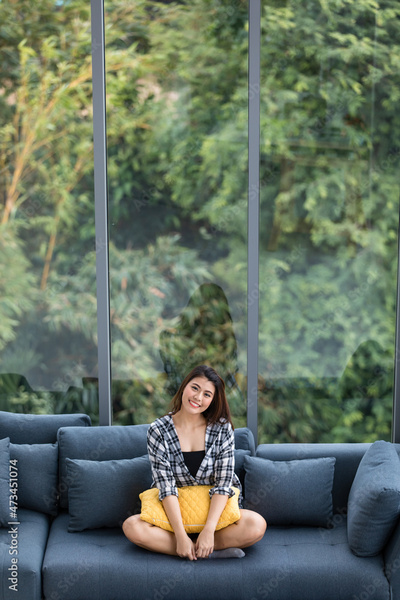 Asian woman sitting on sofa near big glass windows, relaxing alone in house with green forest in background.