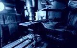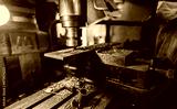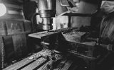 Milling machine working near worker with a protective mask. Tool for cut metal workpiece. Vertical milling machine with cemented carbide milling cutter. Steel manufacturing industry. Milling process.
