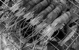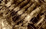 Grilled prawn on charcoal grill. Giant freshwater prawns grill on a flaming charcoal fire. Closeup giant river prawn cooking on barbecue grill rack. Cooking food for the party. Thai food culture.