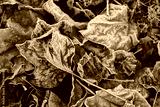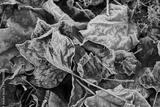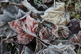 Various leaves covered by frost on winter season in the garden. Winter background on selective focus
