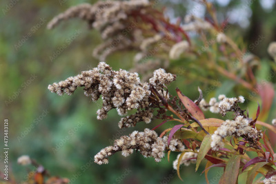 Canadian goldenrod flowers with seeds on autumn season. Withered Solidago canadensis flowers