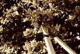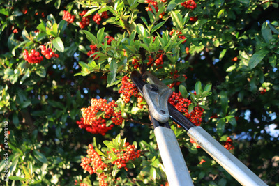 Pruining a Pyracantha bush with many red berries in the garden on summer season. Cut Firethorn tree