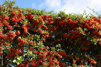 Pyracantha hedge with beautiful ripe red berries in autumn on a sunny day. Firethorn tree