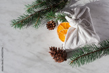 Eco friendly, plastic free, zero waste packed gift. Christmas, New Year concept on white granite table background. Pine cones, dried orange, fir branch. Flat lay, top view, place for text, banner