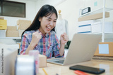 Young asian women happy after new order from customer.