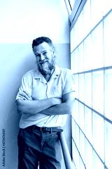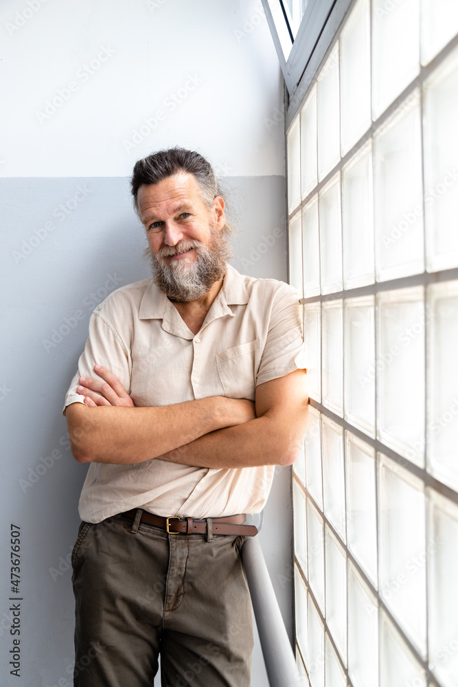 Mature caucasian man with beard looking at camera with arms crossed next to window. Vertical image. Portrait.