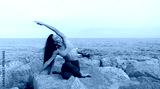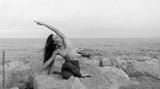 Panoramic image of young woman practicing yoga by the ocean. Gomukhasana with side body stretch. Copy space.