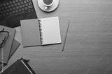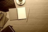 Top view stylish workplace with empty notebook, laptop computer and coffee cup.