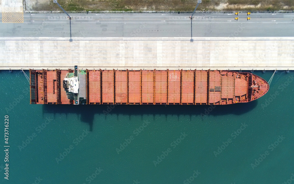 Aerial top view containers ship cargo business commercial trade logistic and transportation of international import export by container frieght cargo ship in the open seaport.