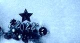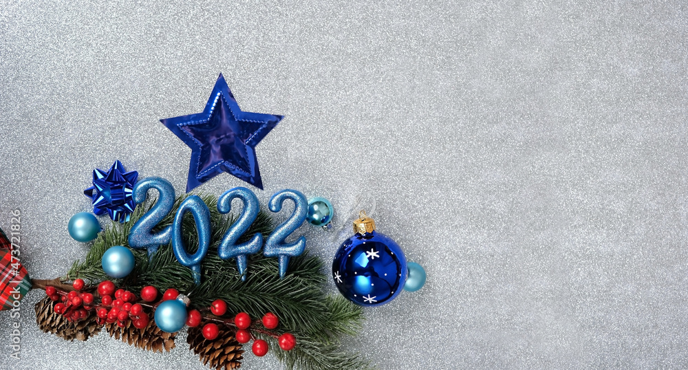 happy New Year 2022 holiday concept. festive winter decorations, 2022 numbers, balls and fir tree branch on silver glittering background. flat lay. banner. copy space