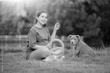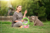 Dog mom happy family, Pregnant women with puppy dog funny and cute, American bully dog , pet lover