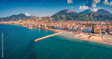 Picturesque morning view from flying drone of Salerno city, Italy, Europe. Impressive summer seascape of Mediterranean sea. Vacation concept background..