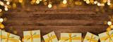 Merry Christmas background holiday greeting card - Frame of bokeh lights, flares and gift boxes present, isolated on rustic dark brown wooden wall texture