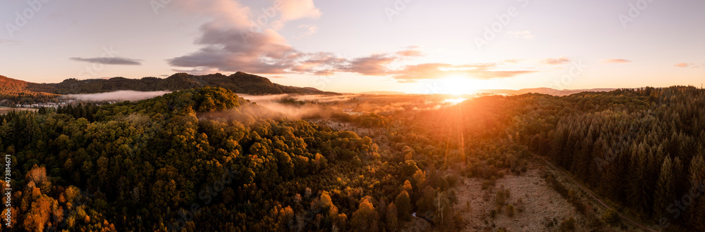 Aerial view looking across a large pine forest with mountains at sunrise with early morning mist, Scotland panoramic