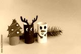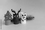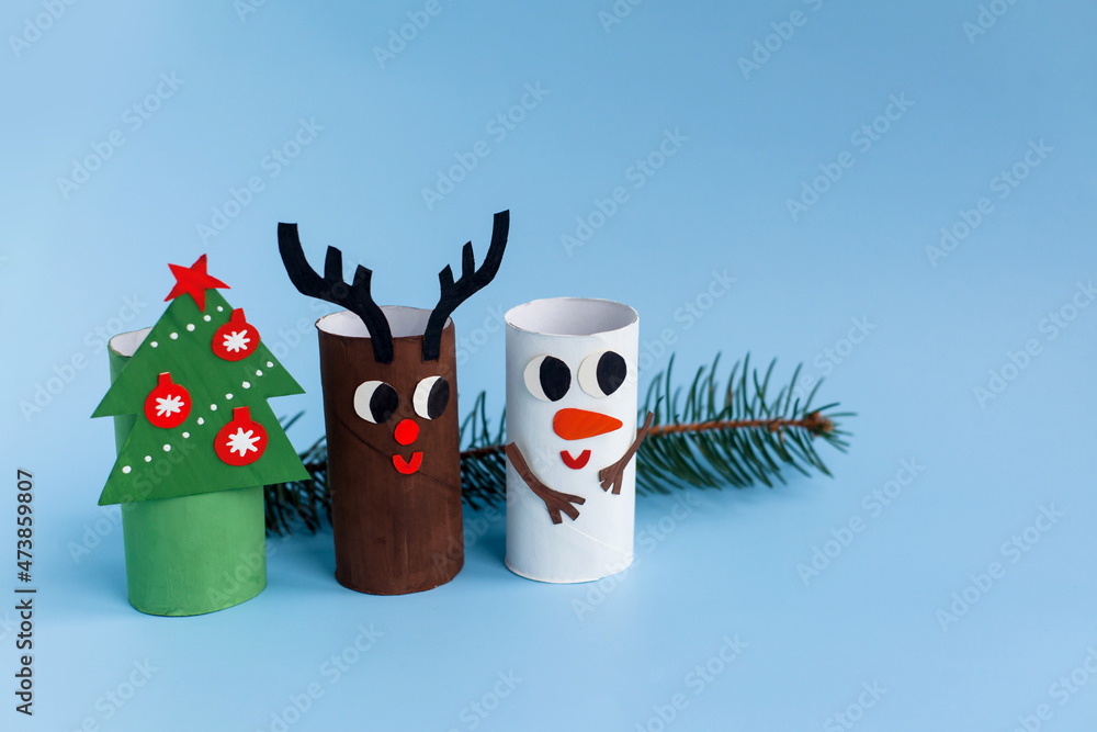 Holiday easy DIY craft idea for kids. Toilet paper roll tube toy Christmas fir tree, snowman, deer on blue background. Creative New Year, xmas decoration eco-friendly, reuse, recycle handmade concept