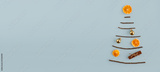 Minimalistic christmas tree from sticks on blue background. Dry orange, cinnamon. New year, eco-friendly, natural materials, zero waste concept. Flat lay, top view, place for text, banner