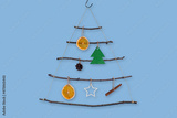 Minimalistic DIY craft christmas tree from sticks on blue background. Dry orange, cinnamon, tag. New year, eco-friendly, natural materials, zero waste concept. Flat lay, top view, place for text