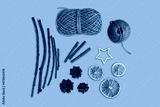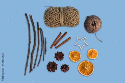 Minimalistic DIY for craft christmas tree from sticks on blue background. Dry orange, cinnamon, tag. New year, eco-friendly, natural materials, zero waste concept. Flat lay, top view, place for text