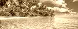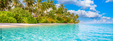 Island panorama, tropical resort in Maldives or French Polynesia, Tahiti. Horizon of panoramic beach, palm trees, white sand, ocean lagoon landscape of paradise beach. Luxury traveling vacation banner