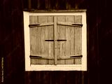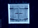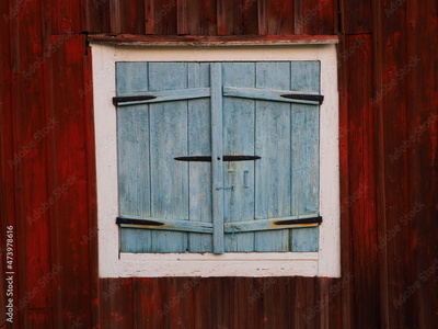 Window with closed wooden shutters, old scandinavian white window with blue shutters on warm brown wall, Öjebyn, Sweden