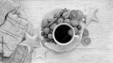 Coffee cup, dried orange slices, nuts, decor stars and knitted sweater on rustic wooden table background. Christmas and New Year holiday. festive winter season. home cozy comfort. flat lay