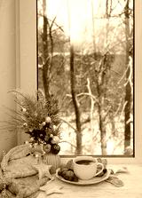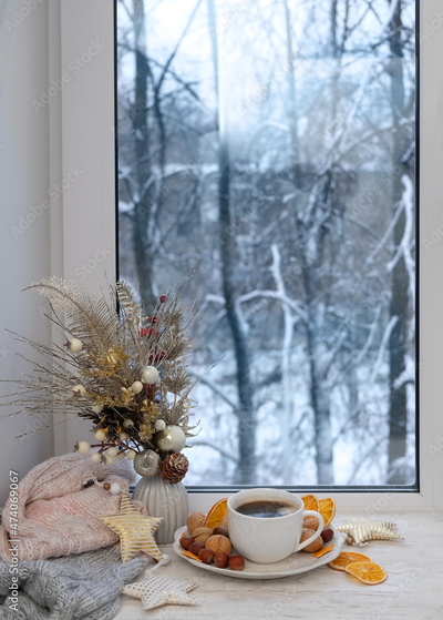 Coffee cup, dried orange slices, nuts, sweater, decor on window sill. snowy window background. Christmas and New Year holiday. festive winter season. home cozy comfort