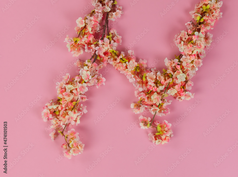 Overhead view of cherry blossoms on a pink background for Mothers Day or Easter holiday