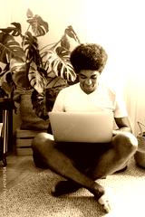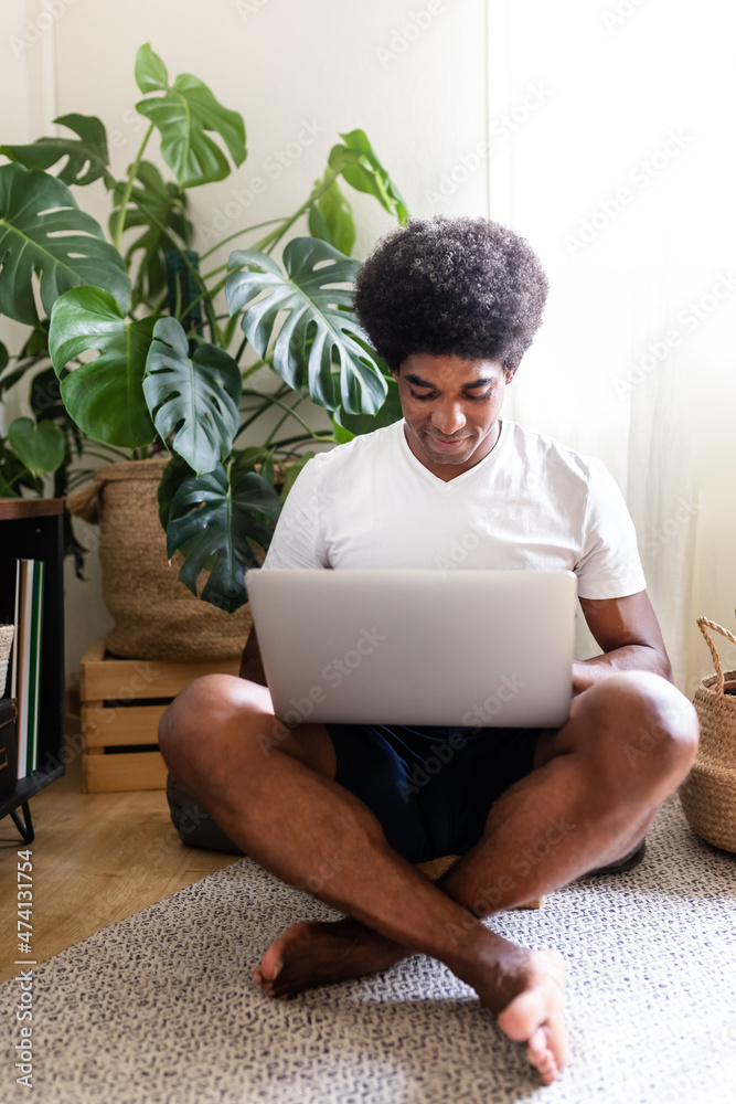 Calm and serene young african american man sitting cross-legged on floor writing an email in his laptop. Vertical image.