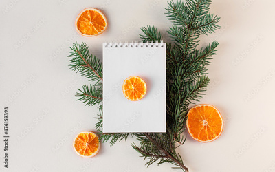 Christmas trendy composition with blank open notebook, fir branches, dried orange on white background. To do list, frame, winter, new year goals concept. Flat lay, top view, copy space, place for text