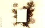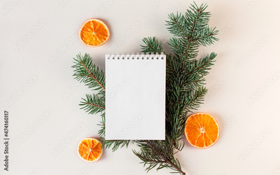 Christmas trendy composition with blank open notebook, fir branches, dried orange on white background. To do list, frame, winter, new year goals concept. Flat lay, top view, copy space, place for text