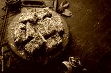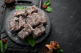 Dessert. Cake with coconut and chocolate. Baking. Top view, free copy space.
