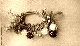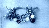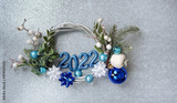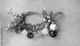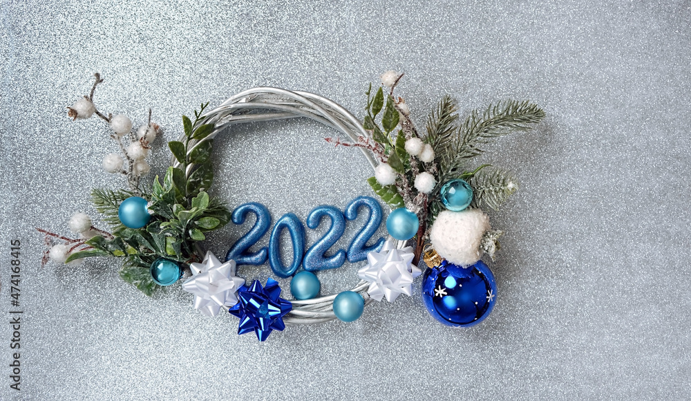 Happy New Year 2022 concept. festive Christmas wreath, 2022 numbers, balls and bows on silver glittering background. flat lay. copy space