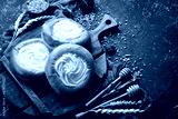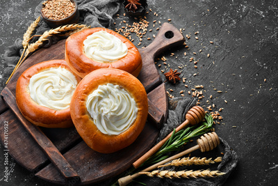 Bakery- sweet buns with cottage cheese. Baking from rye and flour. Top view. Rustic style.