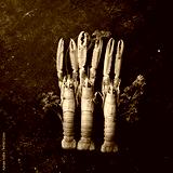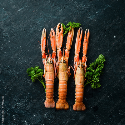 langoustines. Norway lobster on a black stone background. Raw scampi. Top view. Free copy space.