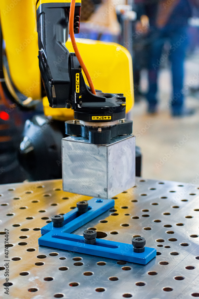 Robot manipulator moves a metal cube
